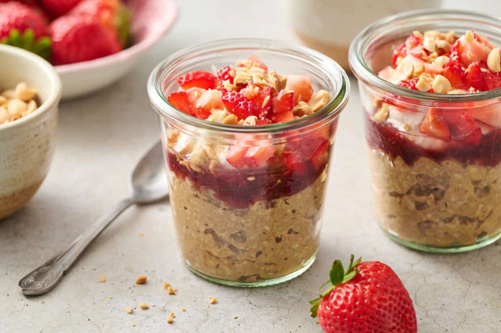 two glass jars filled with overnight oats, jelly, yogurt, chopped fruit and peanuts with a spoon on the side