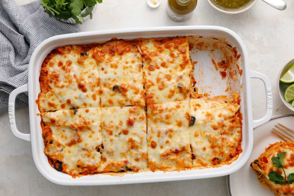 - Slice the casserole into square servings and serve topped with sour cream, guacamole, avocados, cilantro, or anything you like with southwest flair!